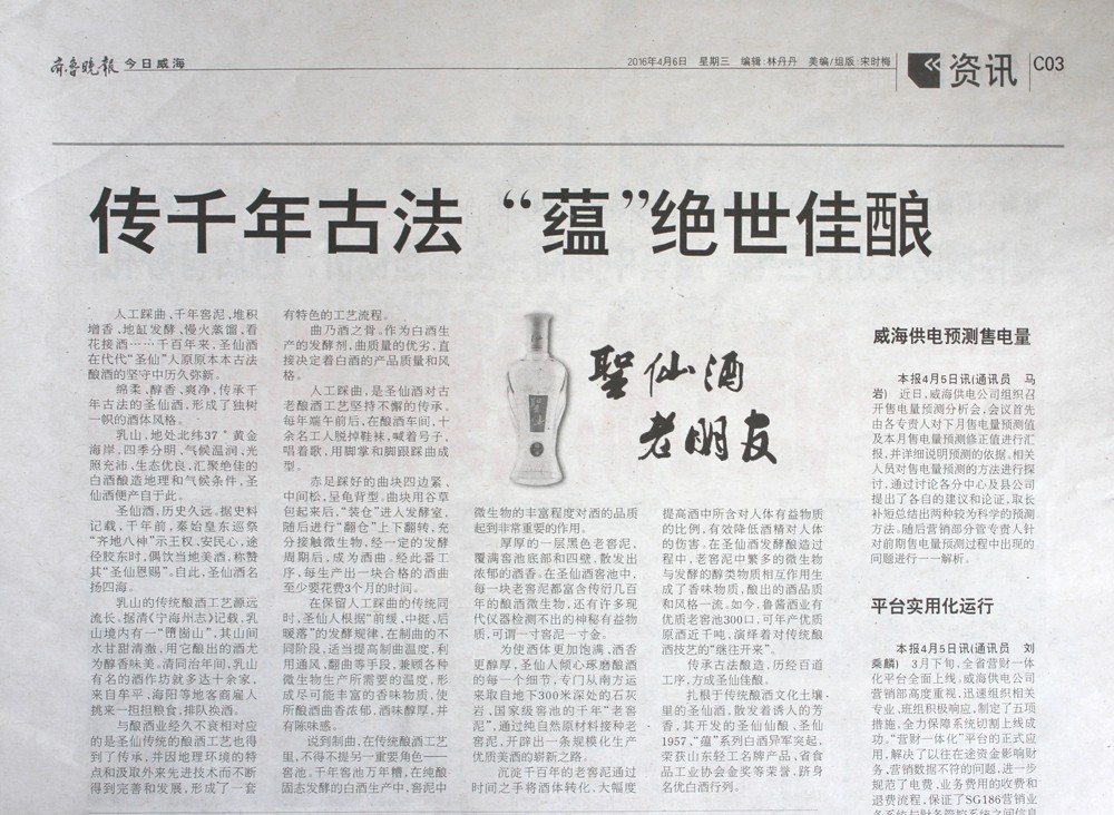 自3月22日起,《齐鲁晚报》对鲁酱酒业进行了一系列的跟踪报道。从《圣仙酒:香溢千年的胶东老号》到《鲁酱酒业:用口碑缔造品牌》,展现出千百年前老祖宗传下的“酿酒”古法,在乳山人手里依旧原汁原味保留下来,一道道看似简单、实则复杂的老工序,酿出了咱老百姓心里的“乳山味”。某曰:还是一样的配方,还是熟悉的味道……